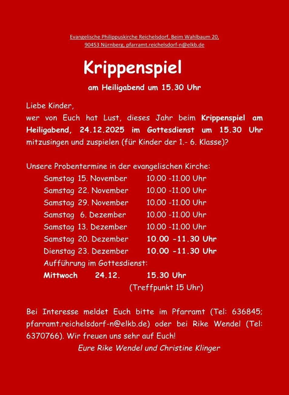 - Telefon Pfarramt 0911-63 68 45 oder Email: pfarramt.reichelsdorf-n@elkb.de