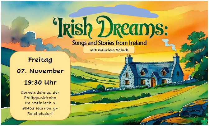 Fotos irischer Momente und Landschaften begleiten den Abend und lassen zusammen mit Gabrieles augenzwinkernden Geschichten in die Kultur ihrer zweiten Heimat eintauchen.