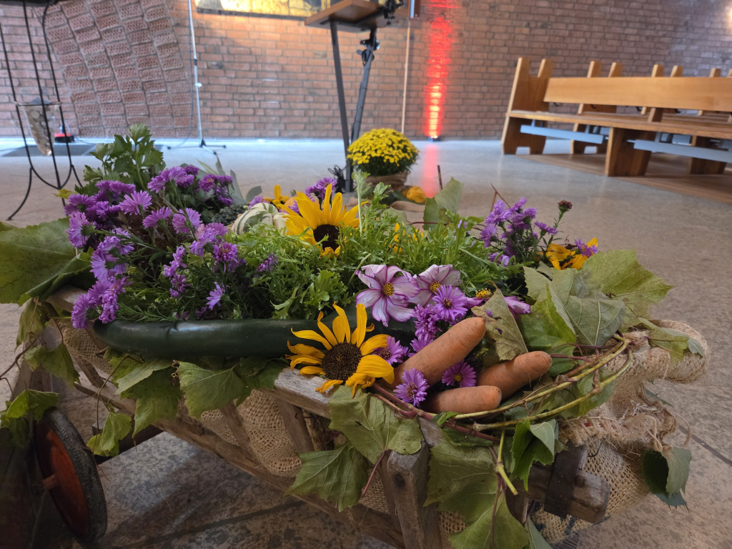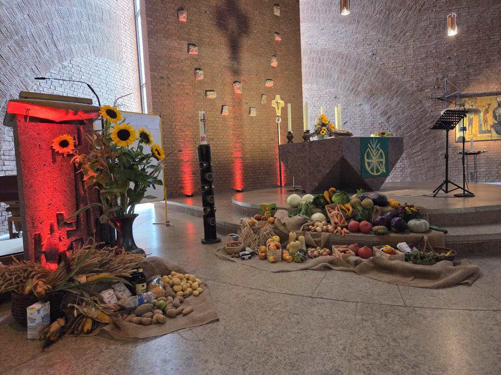 Am 5. Oktober gab es in Reichelsdorf Grund zum Feiern: das Erntedankfest und verschiedene Jubiläen in der Philippusgemeinde. Die Philippuskirche wurde 60 Jahre, der Posaunenchor 90, der Seniorenclub 50 und die Bücherei 60 Jahre alt. Wir begannen unser Gemeindefest mit einem Gottesdienst, der die Dankbarkeit für die Schätze der Philippusgemeinde zum Thema hatte. Zu Beginn sang der Chor und mehr als 50 Kinder schoben gemeinsam den Wagen mit den Erntegaben zum Altar. Während die Erwachsenen danach in der Kirche blieben, beschäftigten sich die Kinder an verschiedenen kreativen, musikalischen und bewegten Stationen draußen und drinnen mit dem Thema Erntedank.