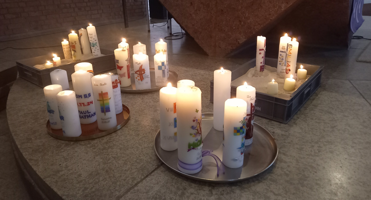 Am 15. März 2026 feierten wir im Rahmen eines Familiengottesdienstes Tauferinnerung. Viele Christen wurden als Babys getauft und können sich nicht daran erinnern und manche unserer Gottesdienstbesucher sind (noch) nicht getauft. Da war es schön, sich mit der (eigenen) Taufe zu beschäftigen und mit mehreren Sinnen nachzuspüren. Nach gemeinsamen Liedern und Gebeten führten zwei Kinder uns in einem Rollenspiel zum Thema des Gottesdienstes: dem Wasser und seiner Rolle bei der Taufe. Pfarrerin Rike Wendel sprach in einer kurzen Predigt über die Bedeutung, bevor die Kinder, Jugendlichen und Erwachsenen an drei Stationen ihre Taufkerzen anzünden, sich segnen lassen und eine Kleinigkeit basteln konnten. Wer lieber sitzen blieb, konnte der Musik lauschen und die Predigt in ausführlicher Form lesen. Der Gottesdienst war für Groß und Klein eine schöne Gelegenheit, über die Taufe nachzudenken, und bestimmt hat so mancher im Anschluss zu Hause noch das eigene Tauf-Fotoalbum angesehen und die Gedanken des Gottesdienstes mit in die neue Woche genommen.