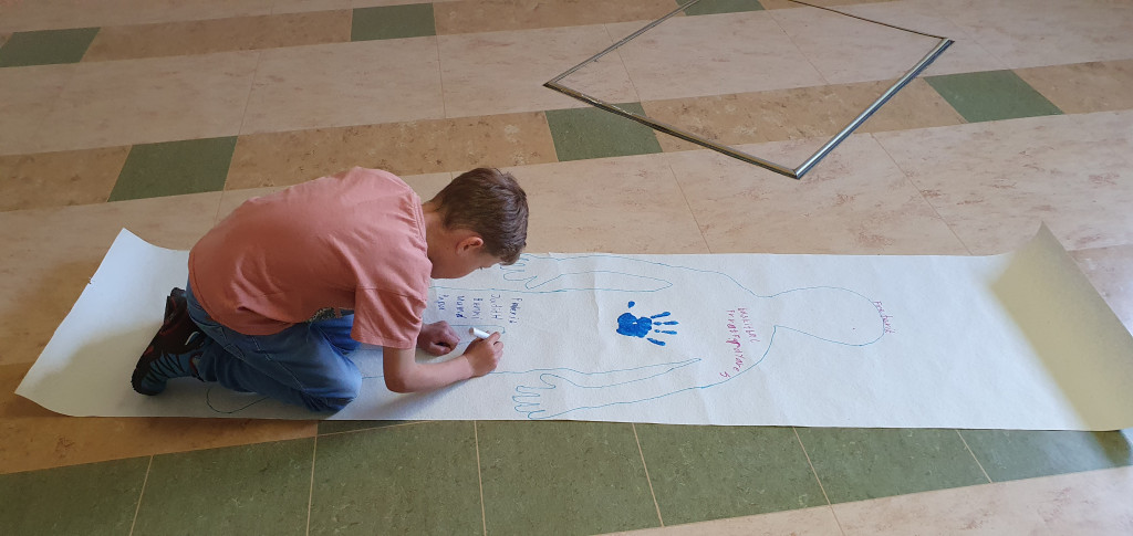 Um 10.00 Uhr riefen uns die Glocken in die Kirche zu einem gemeinsamen Gottesdienst. Der Psalm 139 „Von allen Seiten umgibst du mich …“ stand im Mittelpunkt. Unsere kleinsten Besucher übten gemeinsam ein Lied ein und gestalteten zum Thema den Kirchhof bunt. Auch die Schulkinder beschäftigten sich mit dem Psalm und malten einen Umriss ihres Körpers auf Tapetenrolle. Dieser wurde mit schützenden Handabdrücken umgeben.